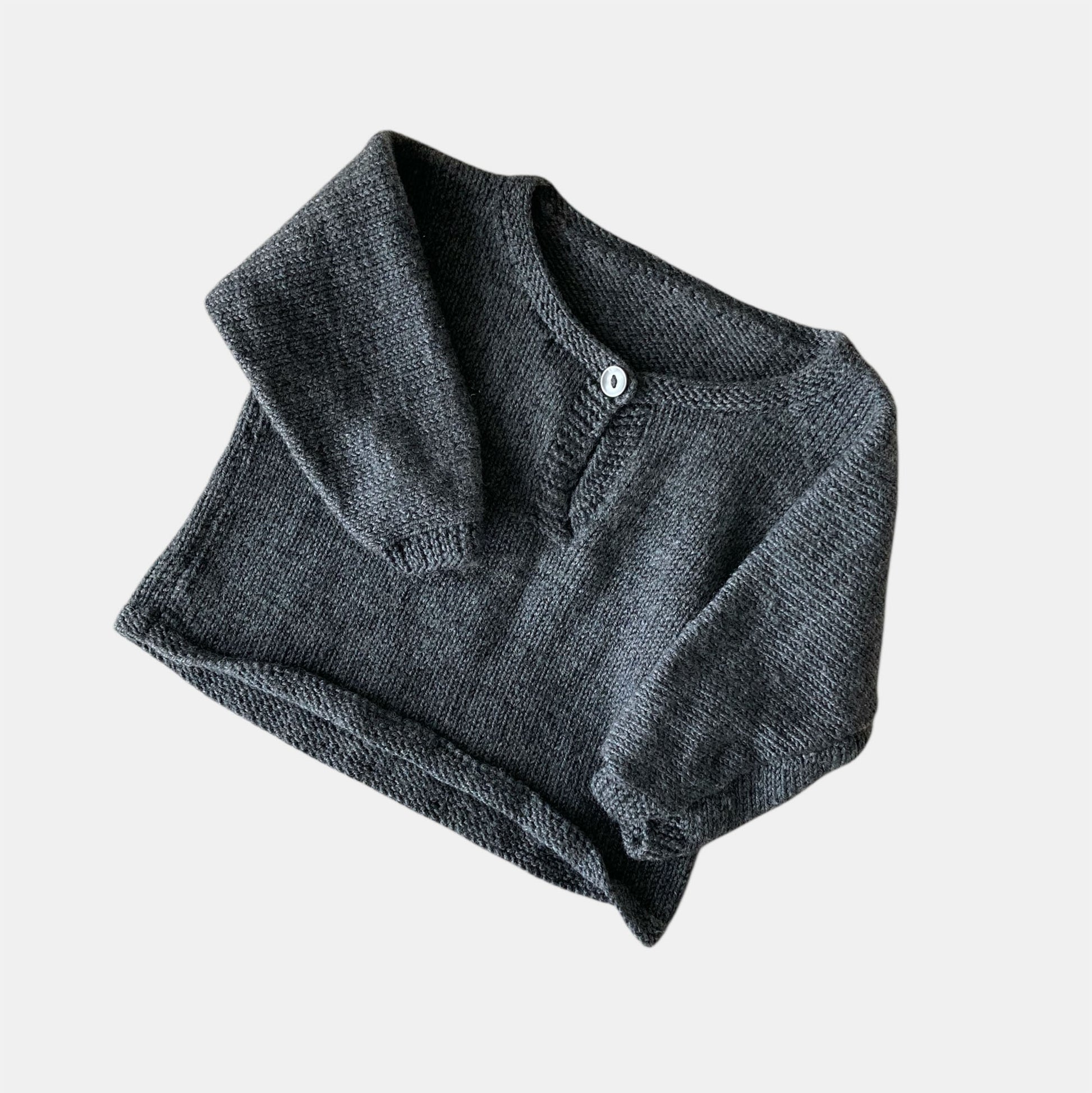 Ein wunderschönes, handgestricktes Einzelstück im Vintage-Stil: Dieser niedliche Pullover zeichnet sich durch einen feinen Tropfenausschnitt mit hübschem Knopf und liebevoll gearbeiteten Zierkanten aus. Das dunkle Grau verleiht ihm eine schlichte Eleganz, während das weiche, anschmiegsame Material für Gemütlichkeit sorgt – perfekt für kühle Tage.