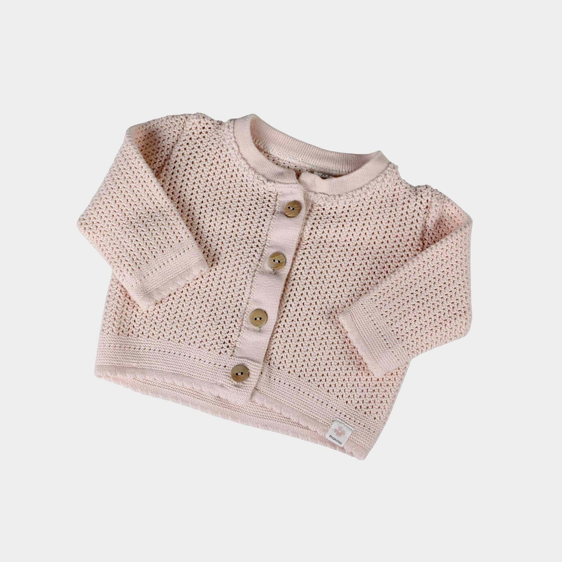 Ein zartrosa Strickjäckchen von Maximo, das mit seinen natürlichen Holzknöpfen einen besonders liebevollen Look erhält. Die weiche Strickqualität sorgt für angenehmen Tragekomfort und macht die Jacke zu einem zeitlosen Basic für Babys. Perfekt kombinierbar und ideal für jede Jahreszeit.